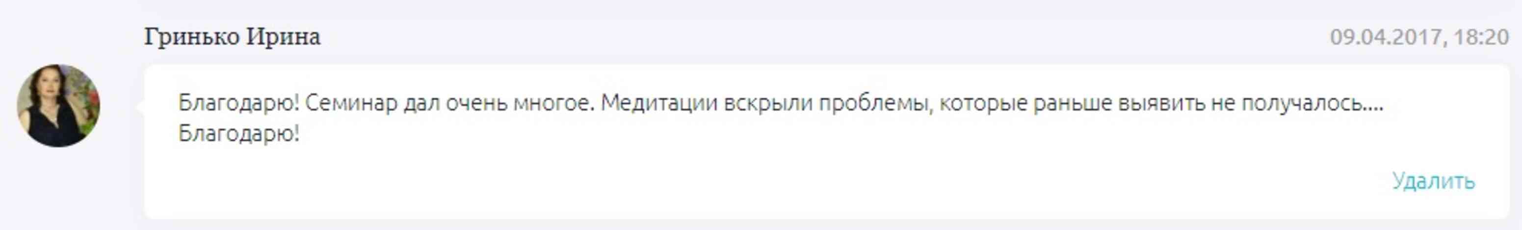 Благодарю! Семинар дал очень многое. Медитации вскрыли проблемы, которые раньше выявить не получалось…