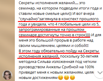 «Без всяких сомнений, каждый из нас о чем-то мечтает. Но далеко не каждый пытался воплотить свои заветные мечты в жизнь. А все потому, что мы либо боимся кардинально изменить свою жизнь, либо просто не представляем как именно необходимо действовать, чтобы достичь желаемого. Новейшая Методика достижения целей, основанная на последних научных открытиях в сфере работы человеческого мозга от компании Silva International, позволяет с легкостью трансформировать ваши мечты в конкретные и четко очерченные цели, которые исполняются одна за одной! Мы проводим этот Интенсив именно в преддверии Нового Года, когда все люди склонны верить в чудеса. В это время эта методика дает просто волшебные результаты! И я приглашаю вас присоединиться к нам, чтобы очень качественно запрограммировать Новый 2022 Год и наполнить его исполнением ваших заветных желаний!»