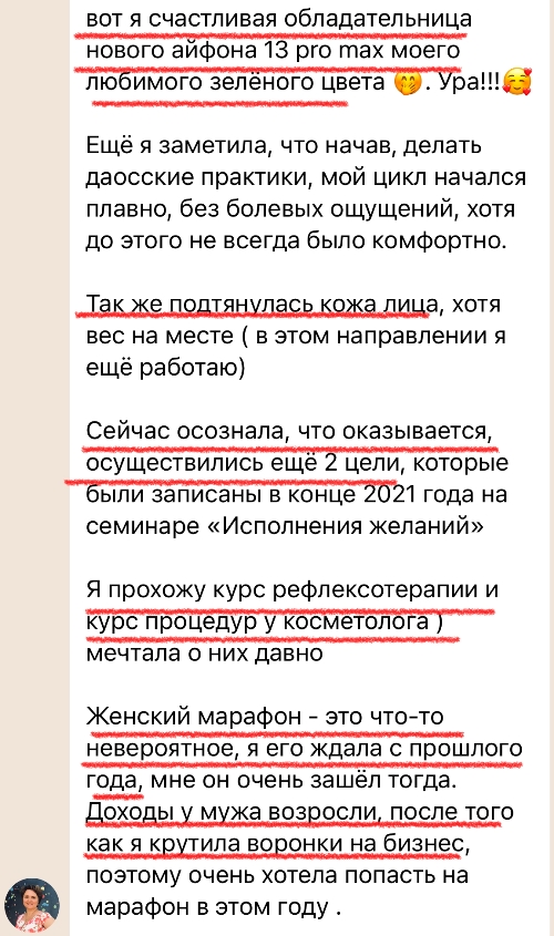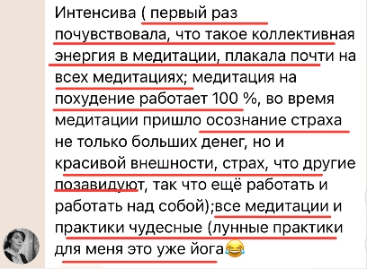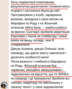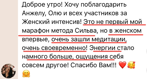 Я рада снова проводить Женский марафон снова и снова, потому, что вижу, насколько важны и необходимы эти знания женщинам. С детства нас учат многому, но упускают самое важное — нас не учат быть Женщинами. Во время марафона практически на глазах меняется отношение участниц к себе, меняются их жизни. Научившись использовать древние практики и современные женские медитации, они расцветают и обретают веру в себя и свои возможности!