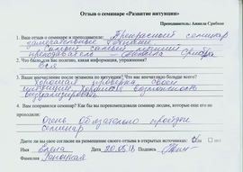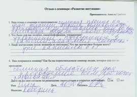Удивительный семинар. Глубокая осознанность своих возможностей. Удивила интуиция – замечательный уровень..